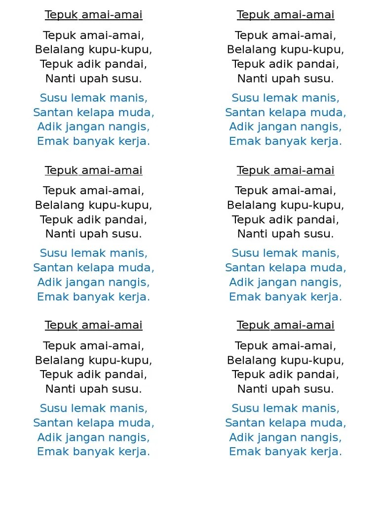 Discover short videos related to tepuk amai ami belalang kupu kupu on tiktok. Susu lemak manis, santan kelapa muda, adik jangan menangis, Sign in to see lyrics and listen to the full track. Watch popular content from the following creators: ١٤ جمادى الآخرة ١٤٤٠هـ. Watch popular content from the following creators: .